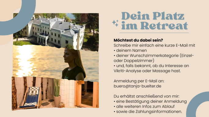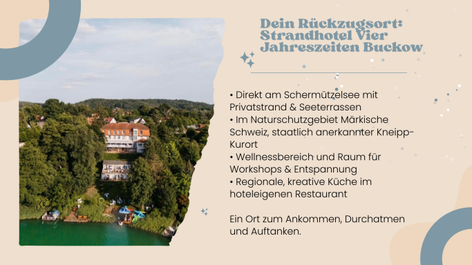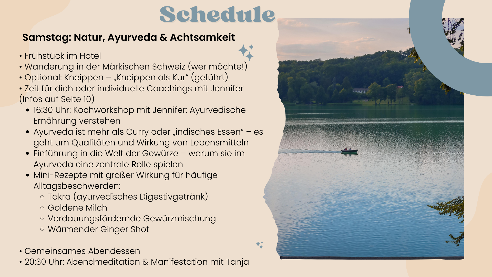 Drei Tage Auszeit am Schermützelsee: mit Ayurveda, Natur, Workshops, Achtsamkeit & Kulinarik. Klicke auf die Bilder! Buchbar über buero@tanja-buelter.de